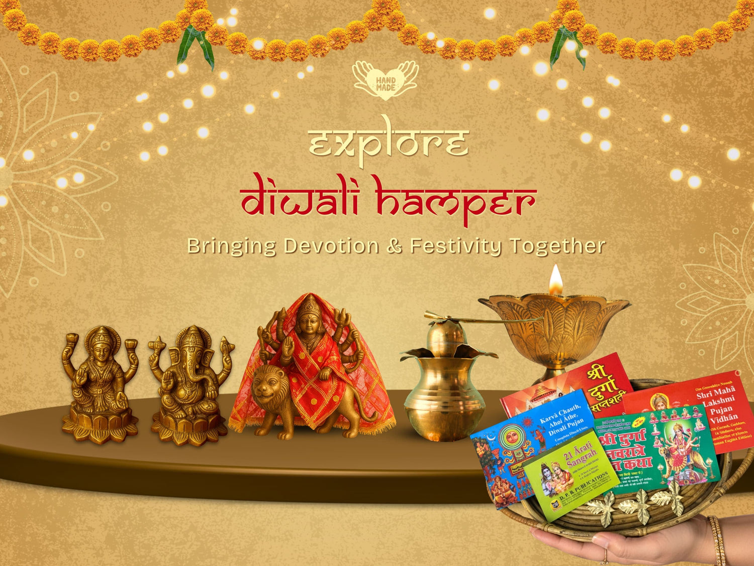 Complete Diwali Pooja Hamper featuring Brass Laxmi-Ganesh idols, pooja thali, akhand jyot, kalash, haldi-kumkum box, toran & chunni — perfect for worship and gifting.