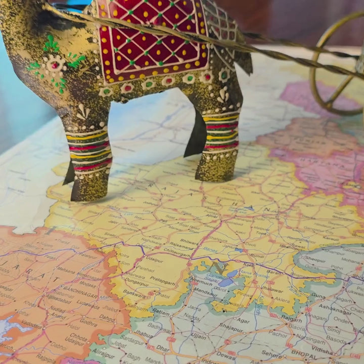 Organize your desk in style with the Antique Camel Rickshaw Pen Stand by Jyoti Handicraft. Made from iron and finished in a vintage antique tone, this handcrafted piece features a camel pulling a traditional rickshaw cart, which serves as a pen or brush holder. The intricate hand-painted accents and folk-inspired design make it more than just a utility item — it's a conversation starter. Whether placed on an office desk, study table, or shelf, it adds a unique cultural touch while keeping your essentials in place. A thoughtful gift for lovers of Indian art, travel enthusiasts, or anyone who enjoys something out of the ordinary.